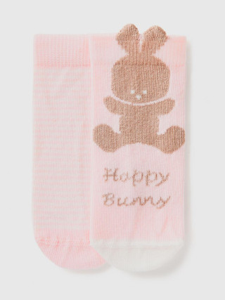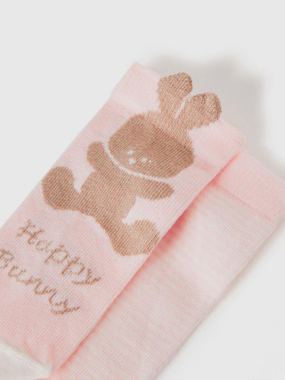 Benetton set od dva para čarapa za bebe od organske mešavine rastegljivog pamuka. Dužina iznad zkočnog zgloba. Jedan par sa tankim prugama, drugi sa sloganom i zekom sa ušima koje vire.
