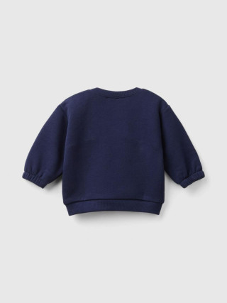 Benetton dukserica dugih rukava za bebe sa okruglim izrezom od čistog organskog pamuka sa čvrstim, ali laganim osećajem. Na prednjoj strani izvezeno lice životinje sa apliciranim ušima na prednjoj strani. Otvara se dugmadima na levom ramenu, jednim otvorenim dugmetom sa efektom drveta i jednim skrivenim dugmetom.