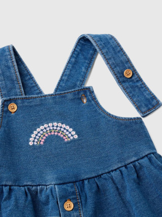 Benetton haljina za bebe od elastičnog pamučnog flisa sa izgledom teksasa. Fiksne naramenice ukrštene na leđima, simpatičan vez na grudima, ukrasna dugmad na suknji. Ležerno i slatko, uparite je sa majicom ili pamučnim džemperom.