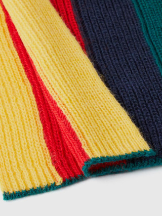 Benetton dečiji vuneni šal sa višebojnim vertikalnim prugastim umetkom. Ovaj proizvod je napravljen na održiv način zahvaljujuc´i projektu VASATEKS, koji omoguc´ava da se voda iz proizvodnog ciklusa povrati i ponovo koristi u narednim procesima.