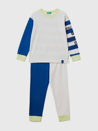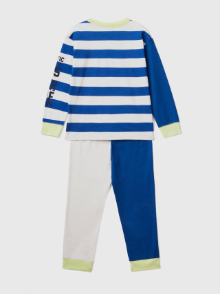 Benetton pidžama za dečake od čistog pamuka. Gornji deo sa okruglim izrezom dugih rukava sa prugastim uzorkom na leđima i dugim rukavima. Pantalone sa elastičnim trakama oko struka i gležnja.