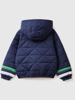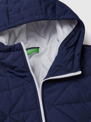 Benetton jakna za dečaka opuštenog kroja od laganog najlona. Ima kapuljaču, patent zatvarač i prednje džepove. Prošiven je dijamantskom šarom.