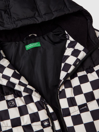 Benetton podstavljena jakna za dečaka od tehničke tkanine Rain Defender, topla, ali ultra lagana, sa podstavom Duck Free. Kapuljača i jaram jednobojni, crno-beli karirani dezen na ostatku komada. Podstavljena kapuljača od mekanog flisa, kopčanje na patentni zatvarač i praktični prednji džepovi.