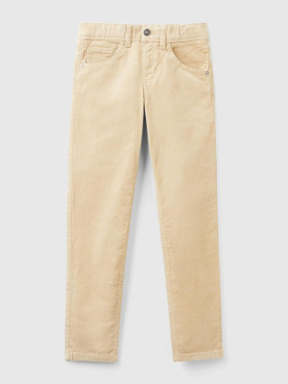Benetton slim fit pantalone za dečaka od somota od rastegljivog pamuka sa tankim rebrima. Dizajn sa pet džepova, patent zatvaračem i kopčanje dugmetom. Izvezen logo na desnom zadnjem džepu. Ležerne, udobne i svestrane.