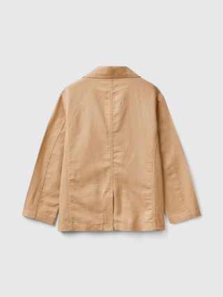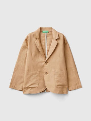 Benetton sako za dečaka na rever, prednjim kopčanjem na dugme i džepovima na dnu. Ovaj komad je napravljen od mešavine pamuka i lana: otpornih biljnih vlakana koje se mogu reciklirati i koje troše minimalne prirodne resurse.