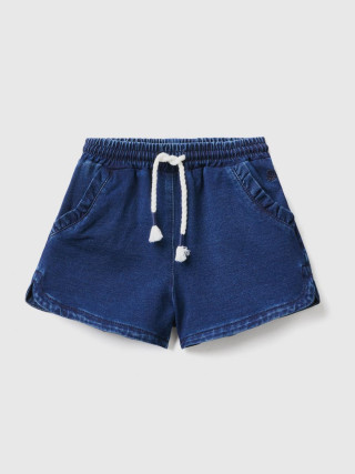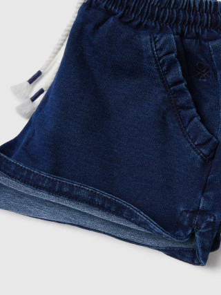 Benetton šorts za devojčicu od mešavine rastegljivog pamuka sa izgledom teksasa. Skupljena unutrašnja elastična traka u struku. Prednji džepovi sa ukrasnim volanima na ivici i malim logom izvezenim na levoj strani. Savršeno za trčanje i igru napolju.