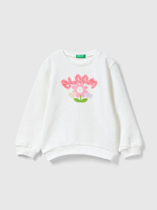 Benetton dukserica dugih rukava za devojčicu sa okruglim izrezom od čistog pamuka sa laganim osećajem. Regularnog kroja, štampa obogaćena posebnom aplikacijom u izgledu latica. Ženstveno i zabavno.