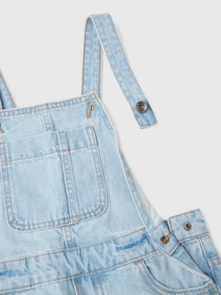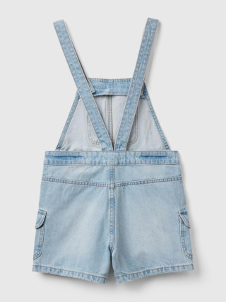 Benetton šorts na tregere za dečaka od čistog pamuka sa posebnim laganim izbeljenim tretmanom sa istrošenim izgledom. Fiksirani tregeri sa dugmetom na prednjoj strani, dizajn sa više džepova: zaobljeni džepovi na prednjoj strani, džepovi sa preklopom duž nogavice i na grudima. Idealno preko majice ili košulje, za odeću inspirisanu vintage stilom.