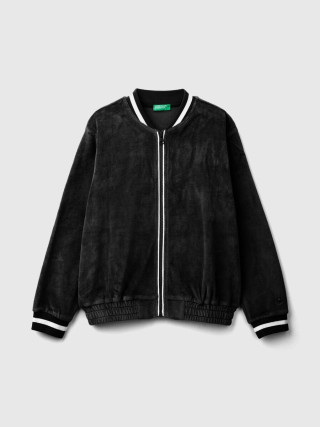 Benetton dukserica za devojčicu od mekanog pliša od mešavine pamuka regular fit kroja. Kopčanje patent zatvarača, kragna u stilu bomber jakne i unutrašnja elastična traka na dnu. Dugi rukav sa izvezenim logom na dnu. Clashing logo izvezen na levom dnu.