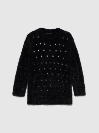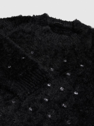 Sisley Young džemper za devojčicu od mekog paperjastog konca, sa otvorenim pletenjem napred i pozadi. Rebrasti pleteni izrez i dugi rukavi sa detaljima na ramenima.