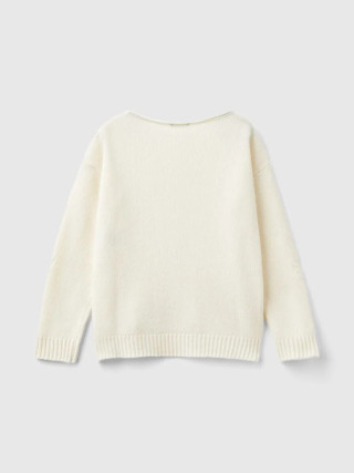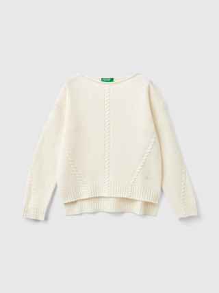 Benetton džemper za devojčicu sa dugim rukavima od mekog vunenog prediva. Okrugli okovratnik sa uvijenim detaljem, neravnim donjim delom koje je duže pozadi, logotipom od štrasa. Prefinjen u svojoj jednostavnosti, sa motivom pletenog kabla na prednjoj strani i na rukavu.