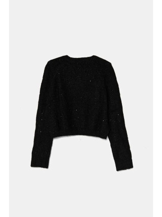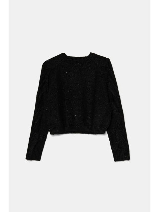 Benetton džemper za devojčicu sa okruglim izrezom od mekog prediva sa šljokicama i lureksom. Dugi raglan krojeni rukavi sa kablovskim pletivom. Napravljen od rastegljive vune i mešavine poliestera. Tkanina sa malim uticajem na životnu sredinu iz sertifikovanih lanaca snabdevanja, daje komadu udobnost, toplinu i mekoću.