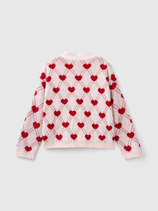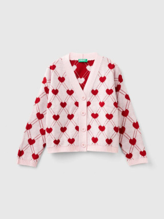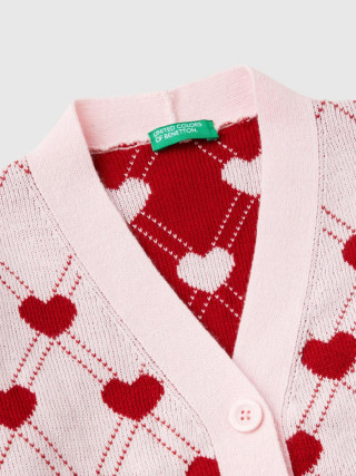 Benetton kardigan za devojčicu sa V-izrezom od toplog, mekog prediva. Dugi rukavi, dugmad sprijeda i romantični motiv srca.