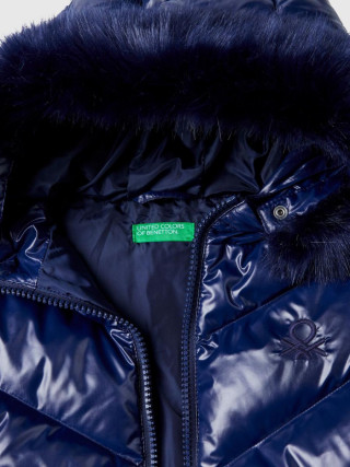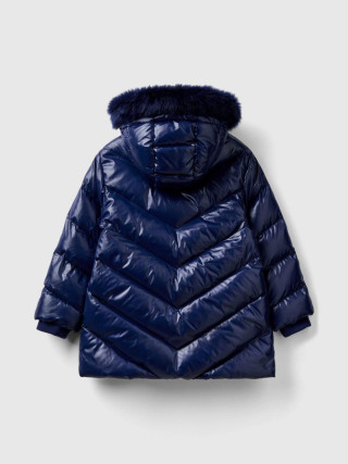 Benetton duga postavljena jakna za devojčicu od sjajne tkanine Rain Defender sa prošivenim šavovima. Kapuljača sa umetkom od veštačkog krzna, kopčanje patentnim zatvarač, prednjim džepovima i izvezenim logom Benetton na levoj prednjoj strani. Responsible Down Standard (RDS) sertifikovano originalno perije, garantuje da korišćeno perije dolazi od gusaka i pataka uzgajanih za hranu u skladu sa načelima dobrobiti životinja.