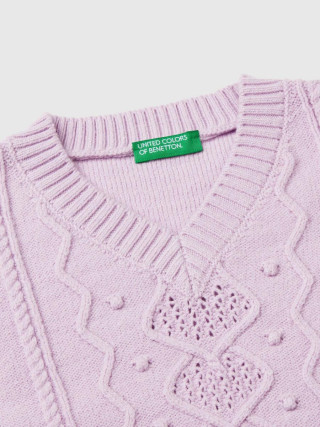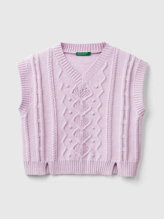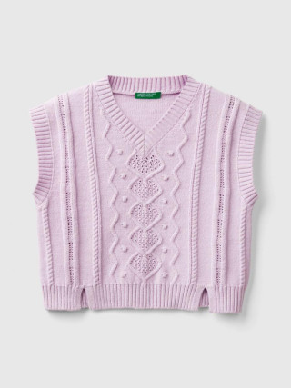 Benetton prsluk za devojcicu od mekog prediva od mešavine pamuka i vune sa prorezima na prednjem rubu. V-izrez, pleteno sa igrom tacaka i motivom srca.
