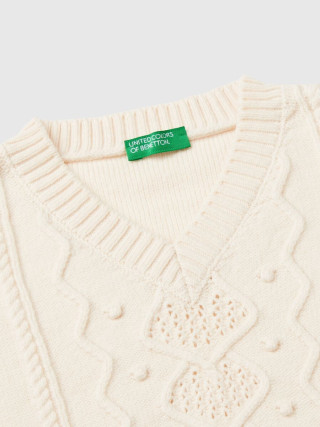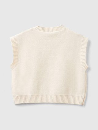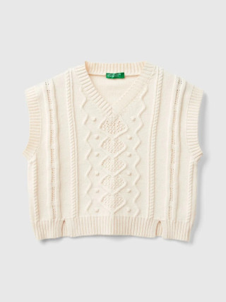 Benetton prsluk za devojcicu od mekog prediva od mešavine pamuka i vune sa prorezima na prednjem rubu. V-izrez, pleteno sa igrom tacaka i motivom srca.