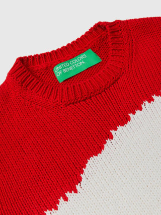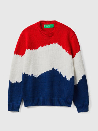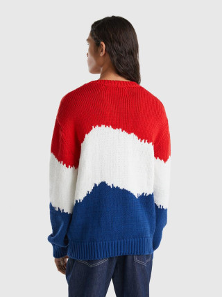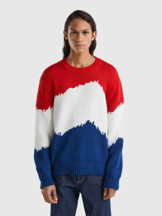 Benetton muški džemper dugih rukava sa okruglim izrezom od mekog čistog toplog pamučnog prediva. Specijalni dizajn sa pletenim umetkom u tri boje.