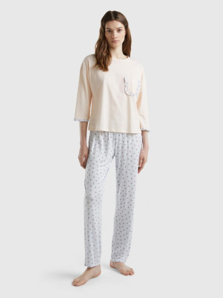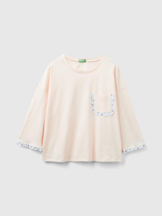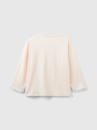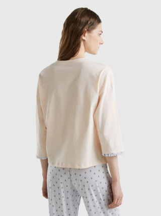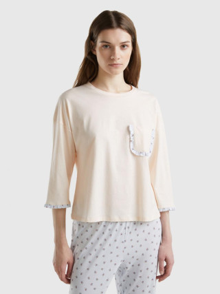 Benetton ženski gornji deo pidžame sa okruglim izrezom od mekog čistog pamuka. Rukavi 3/4 sa spuštenim ramenima, nežni volani sa štampom na bočnim stranama, velikom prednjem džepu i na kraju rukava.