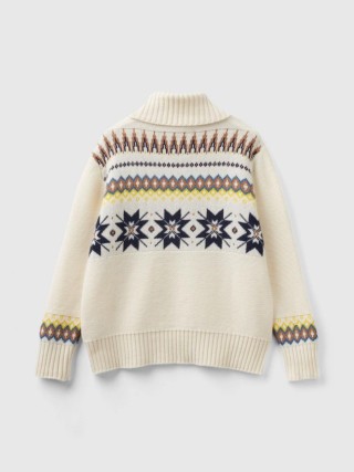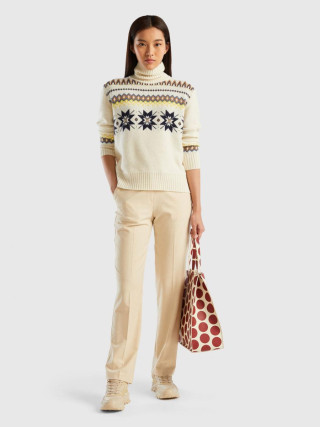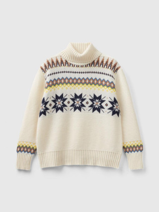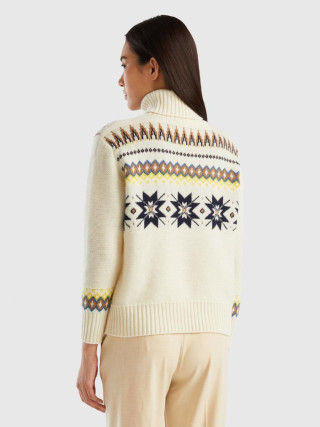 Benetton ženski džemper sa visokim okovratnikom od mekog vunenog prediva. Dugi rukavi i spuštena ramena. Posebno žakar pletenje sa nordijskim inspirisanim geometrijskim motivima. Odec´a sa prijatnim zimskim vibracijama.