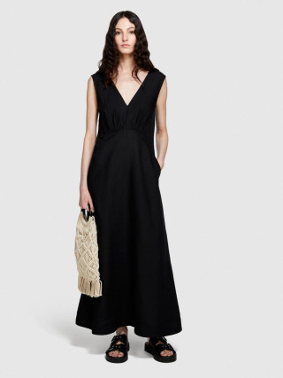Sisley ženska haljina bez rukava od mešavine lana i viskoze, sa V-izrezom, izrezana ispod grudi gde počinje duga suknja u obliku trapeza. Dva džepa uvučena sa strane i bočni patent zatvarač.