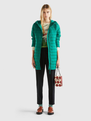 Benetton ženski lagana prošivena jakna sa kapuljačom, od najlona Rain Defender sa likra profilima. Ravnog kroja i dužine iznad kolena. Otvaranje sa prednje strane sa rajsferšlusom, džepovi umetnuti sa strane sa dugmetom. Topla, ali lagana podloga od reciklirane vate, proizvedena od PET plastičnih boca. Savršeno za te prve hladne dane.