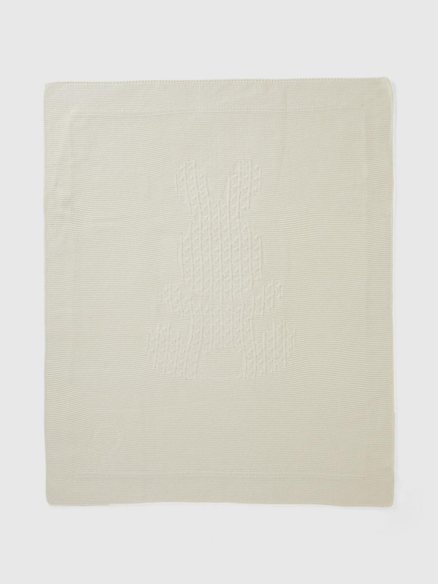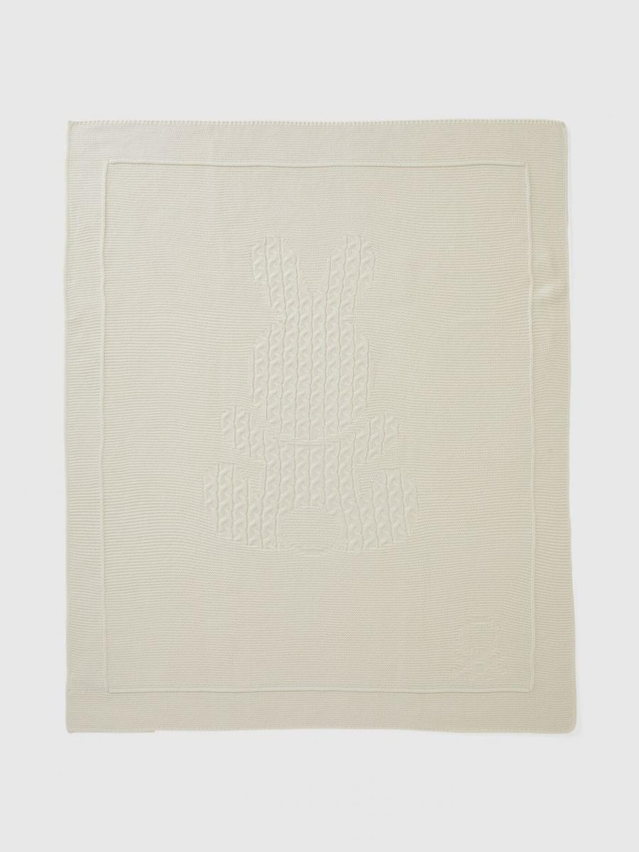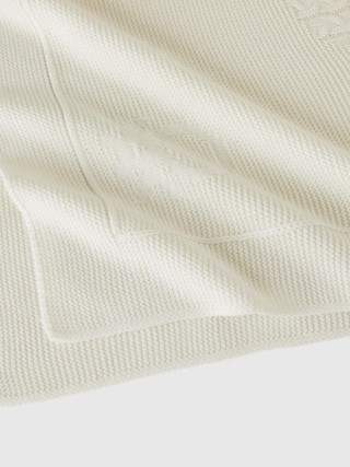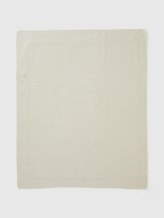 Benetton pokrivač za bebe. Umetak zeka sa kablovskim pletivom, logo na dnu. Ovaj komad je napravljen na održiv način zahvaljujući projektu VASATEKS, koji omogućava obnavljanje vode tokom proizvodnog ciklusa koja se zatim koristi u kasnijim procesima.