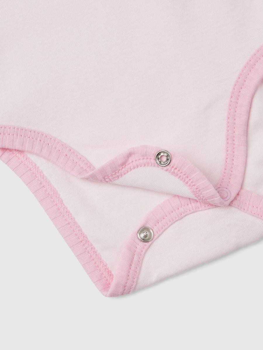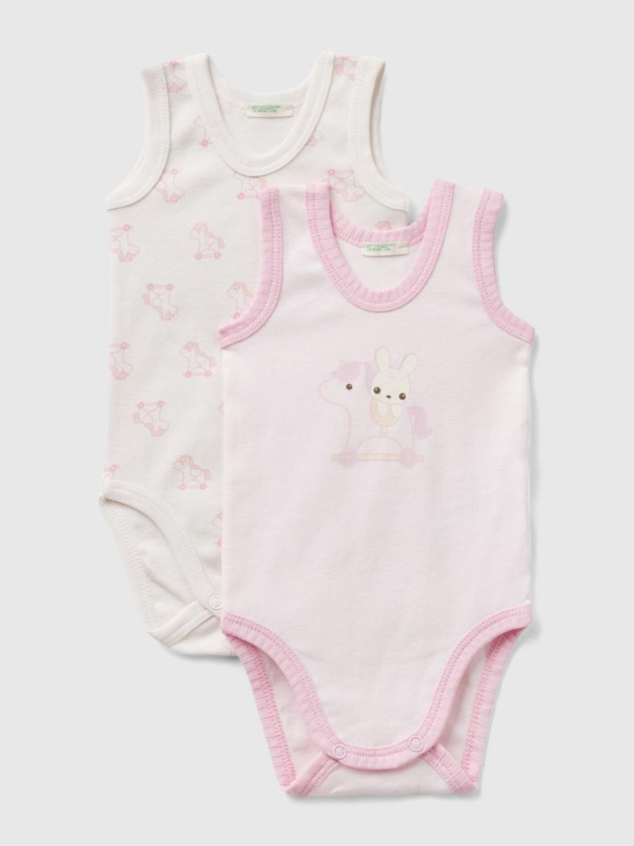 Benetton set za bebe koji se sastoji od dva bodija od tanko rebrastog čistog organskog pamuka. Okrugli vrat i otvor sa dugmićima na međunožju. Jedan sa prednjim životinjskim printom, drugi sa štampom preko celog komada.