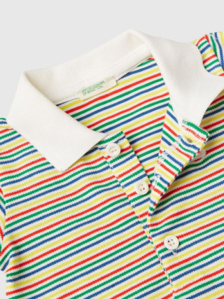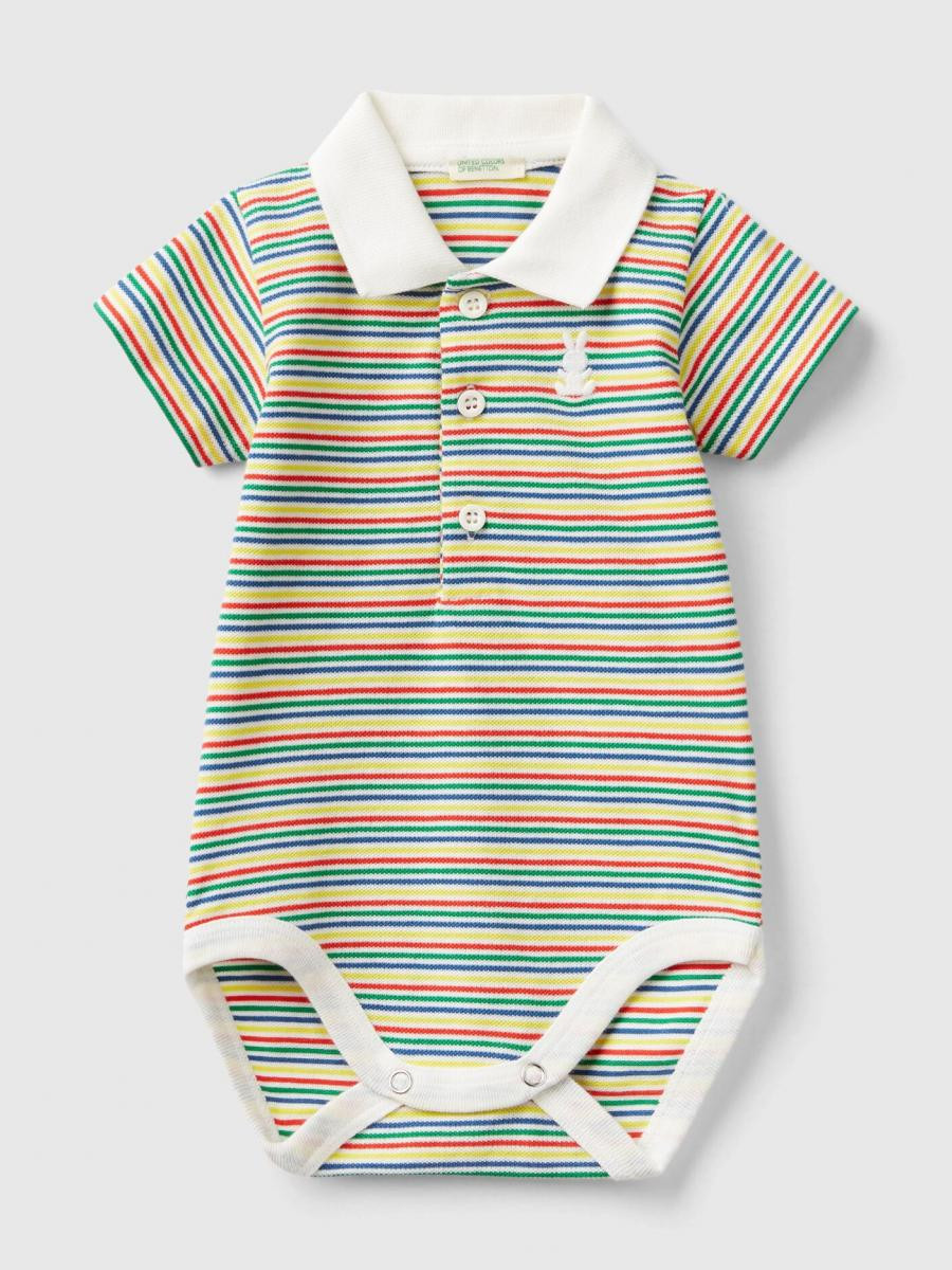 Benetton polo bodi kratkih rukava za bebe od pređe obojenog prugastog rastegljivog pamuka. Vezeni zečic´ na levoj strani grudi, klasična kragna sa delimičnim otvaranjem na dugmiće i kopčanje na međunožju. Casual stil u verziji za bebe.