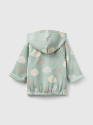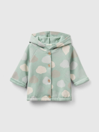 Benetton dukserica za bebe od mešavine rastegljivog pamuka sa toplim osec´ajem i mekom postavom. Sa kapuljačom, dugim raglan rukavima i prednjim kopčanjem sa dugmićima sa efektom drveta. Šareni print po celoj odec´i.