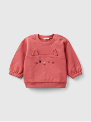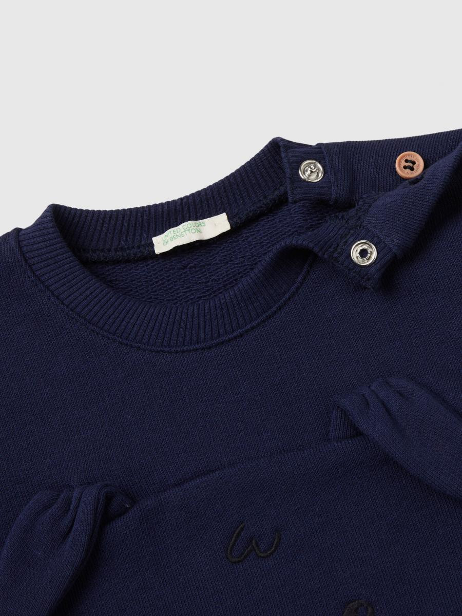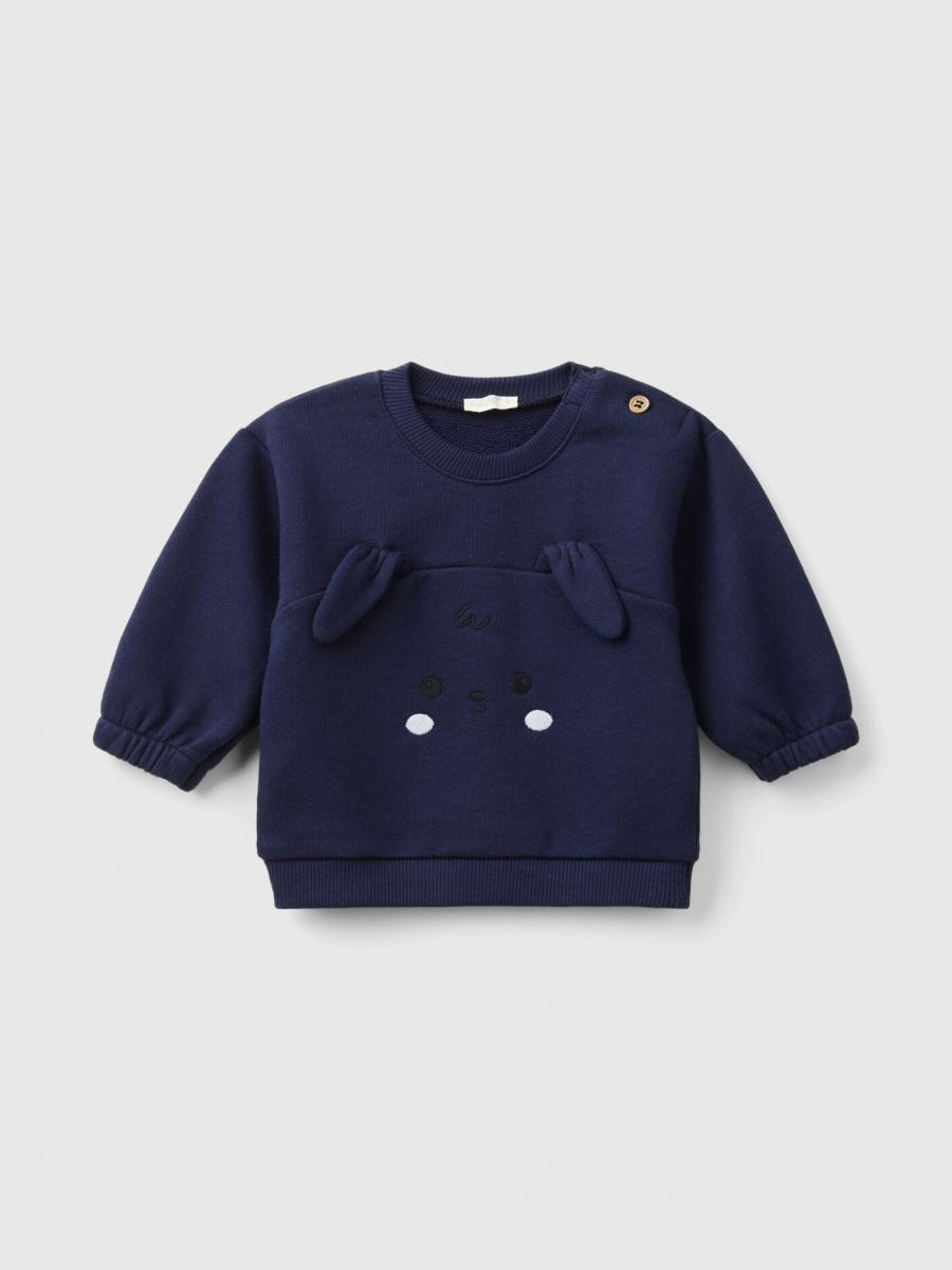 Benetton dukserica dugih rukava za bebe sa okruglim izrezom od čistog organskog pamuka sa čvrstim, ali laganim osećajem. Na prednjoj strani izvezeno lice životinje sa apliciranim ušima na prednjoj strani. Otvara se dugmadima na levom ramenu, jednim otvorenim dugmetom sa efektom drveta i jednim skrivenim dugmetom.