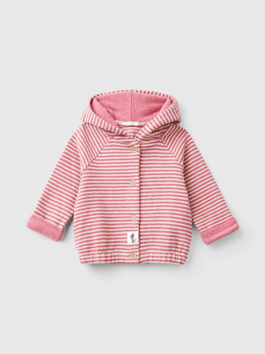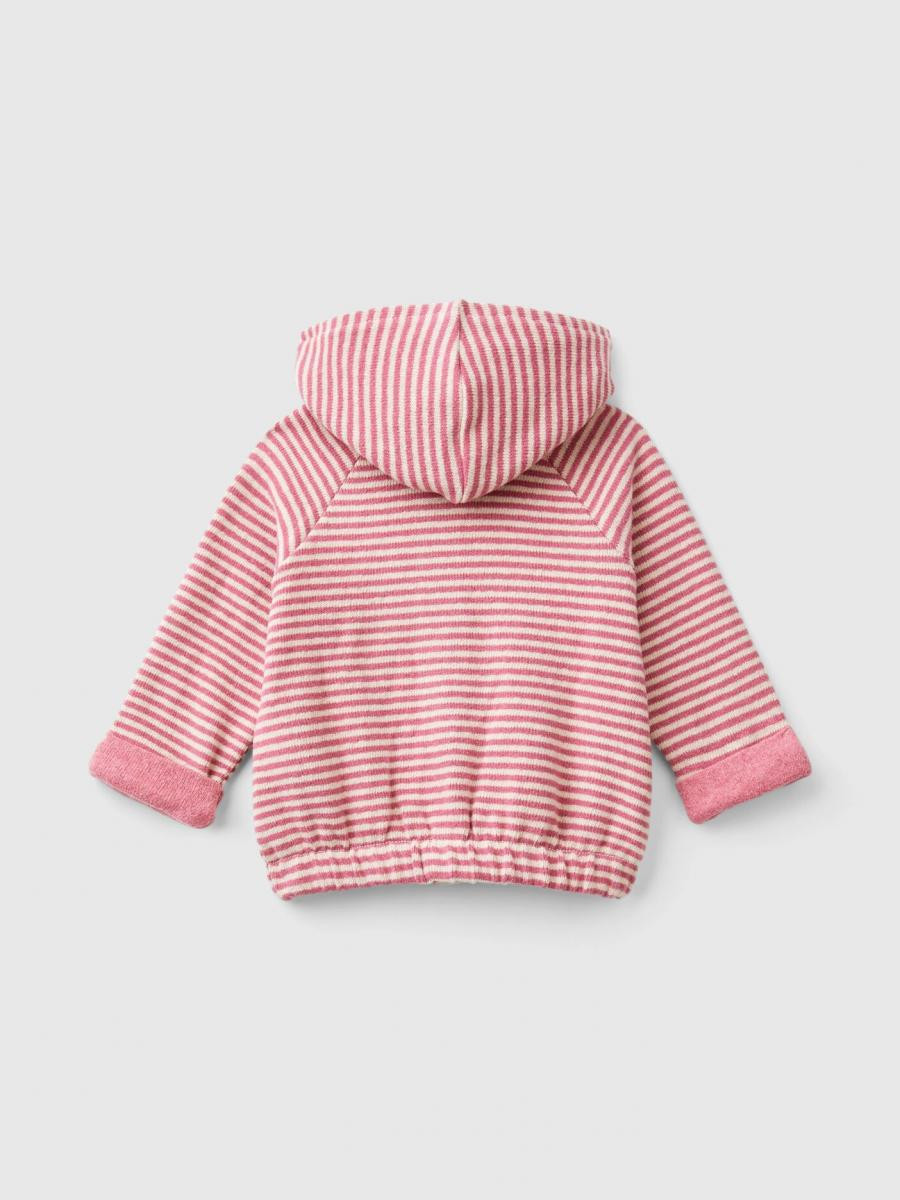 Benetton dukserica za bebe od dvobojne mešavine pamuka sa prugama obojenim predivom. Sa kapuljačom, dugim raglan rezanim rukavima i prednjim kopčanjem.