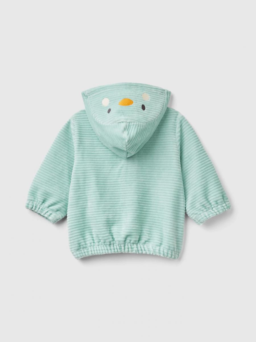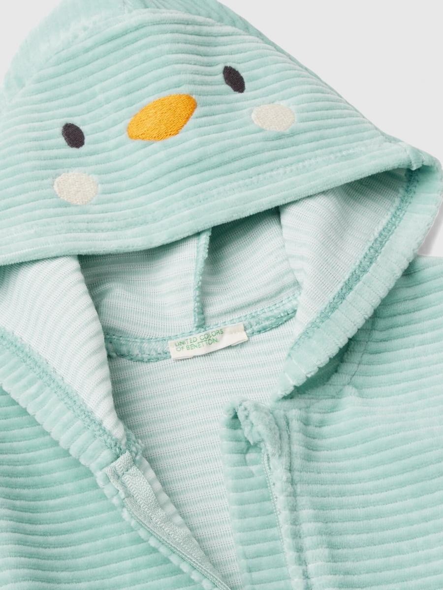 Benetton dukserica dugih rukava za bebe od mekog rastegljivog pamuka od mešavine pliša. Opremljen kapuljačom sa izvezenim životinjskim licem i malom aplikacijom za uši. Pogodno kopčanje sa rajsferšlusom i sigurnosnom zaštitom.