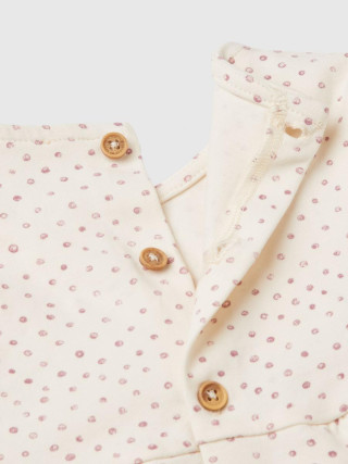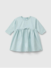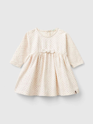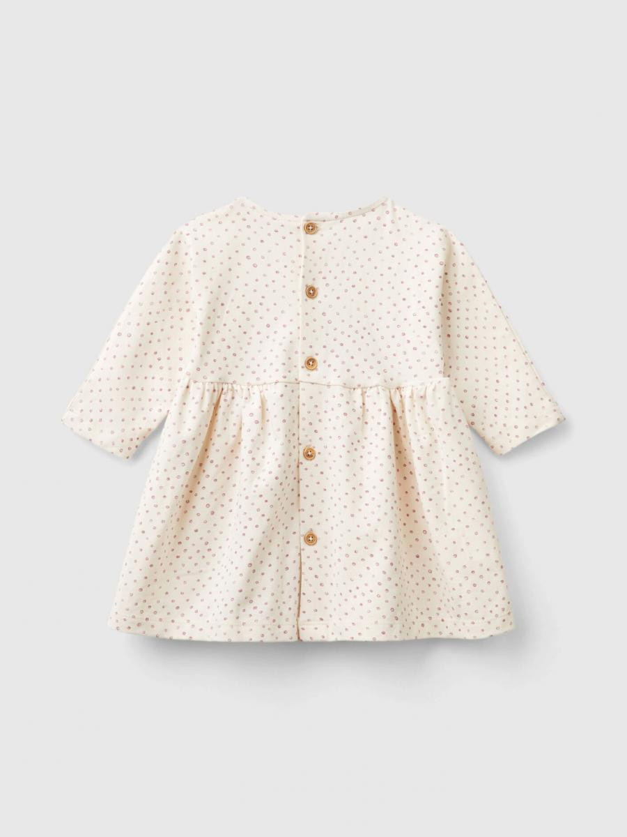 Benetton haljina dugih rukava za bebe od tople meke rastegljive pamučne tkanine. Okrugli izrez, dugi rukavi i otvor na leđima sa dugmadima u izgledu drveta. Izrez u struku sa prednjom mašnom. Štampa sa uzorcima po celoj odeći, za romantičan i ženstven izgled.