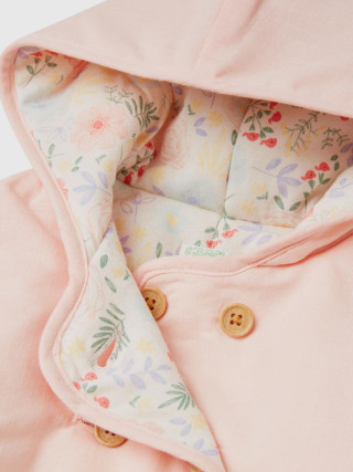 Benetton baby jakna dugih rukava sa kapom, od čistog pamučnog materijala sa laganom postavom. Unutrašnja postava od žerseja sa suptilnim cvetnim printom. Dvoredno kopčanje dugmićima i džepovi na prednjoj strani. Elegantan i udoban komad, savršen za prelazni period.