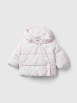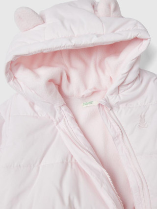 Benetton podstavljena jakna za bebe od meke vate sa horizontalnim šavovima i toplom podstavom od flisa. Kapuljača sa aplikacijom za uši, dijagonalno kopčanje patentnim zatvaračem, izvezen zečić na levoj prednjoj strani. Topla, ali lagana, idealna za novu sezonu.