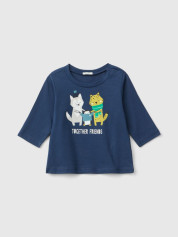 Benetton majica dugih rukava za bebe od čistog toplog organskog pamuka. Okrugli vrat i praktično otvaranje sa dugmadima na levim ramenima. Šarena štampa na prednjoj strani.