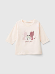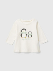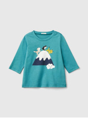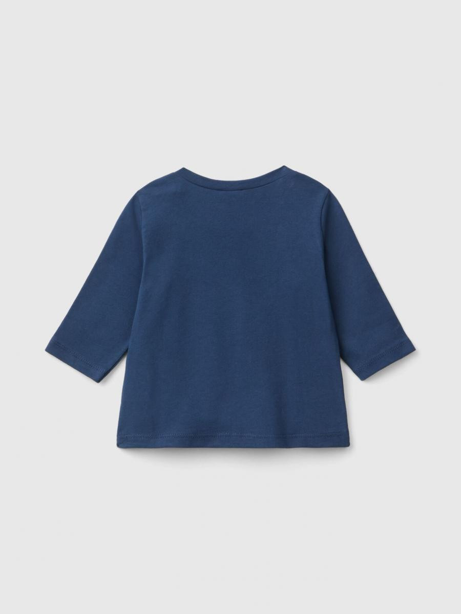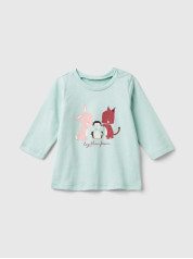 Benetton majica dugih rukava za bebe od čistog toplog organskog pamuka. Okrugli vrat i praktično otvaranje sa dugmadima na levim ramenima. Šarena štampa na prednjoj strani.