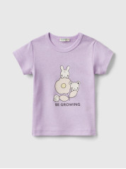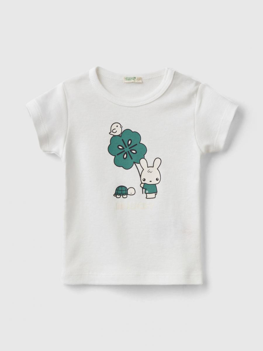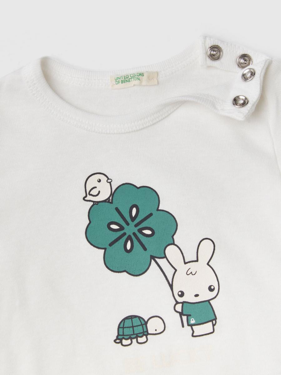 Benetton majica kratkih rukava za bebe sa okruglim izrezom od rebrastog čistog organskog pamuka. Osnovna i udobna, sa skrivenim otvorom sa dugmićima na levom ramenu i štampom na prednjoj strani.