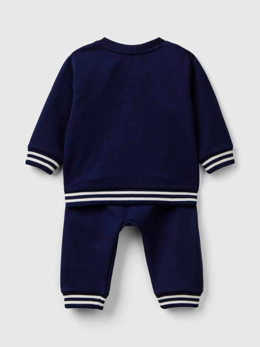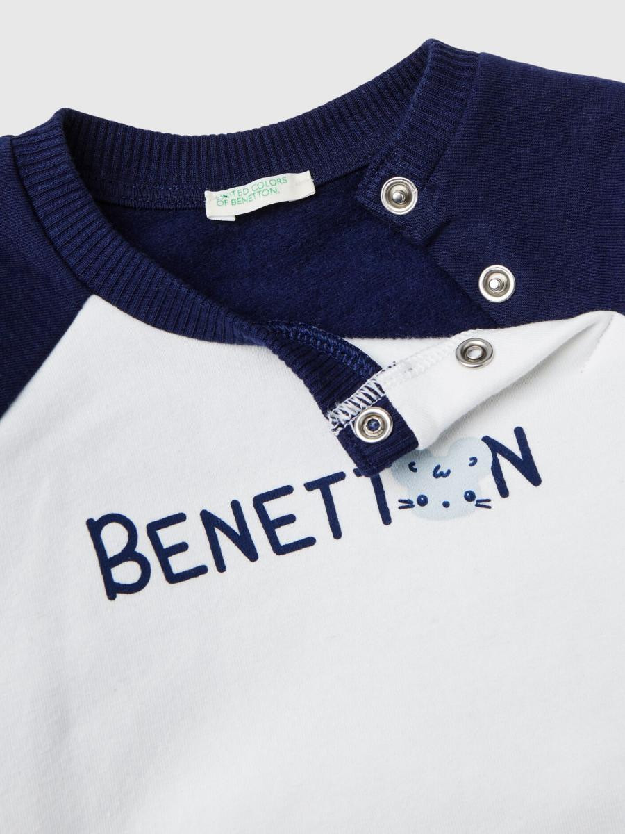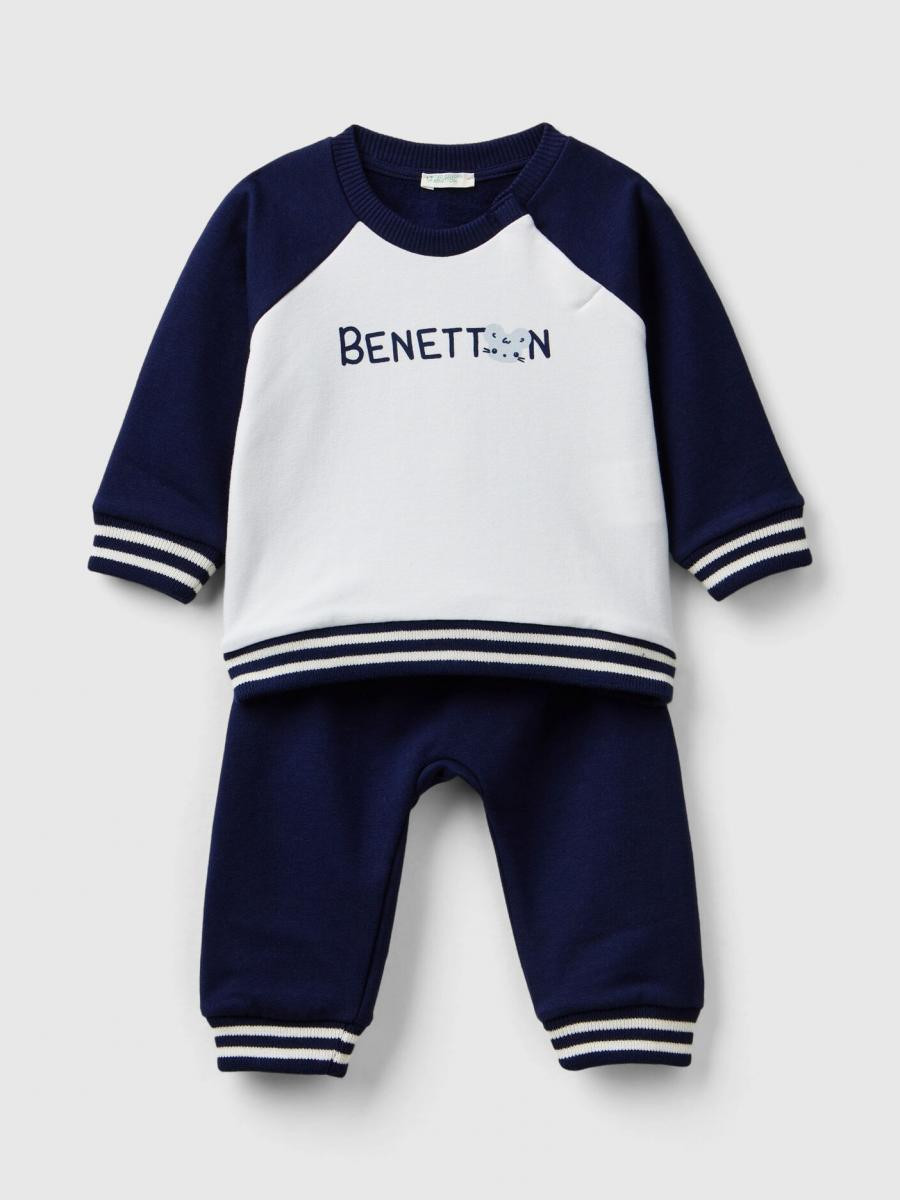 Benetton komplet za bebe od laganog rastegljivog materijala od mešavine pamuka sa prugastim ivicama. Dukserica dugih raglan rukava sa okruglim izrezom sa logom i životinjskim printom na prednjoj strani. Otvaranje sa dugmićima na levom rukavu. Duge pantalone sa unutrašnjom elastičnom trakom u struku.