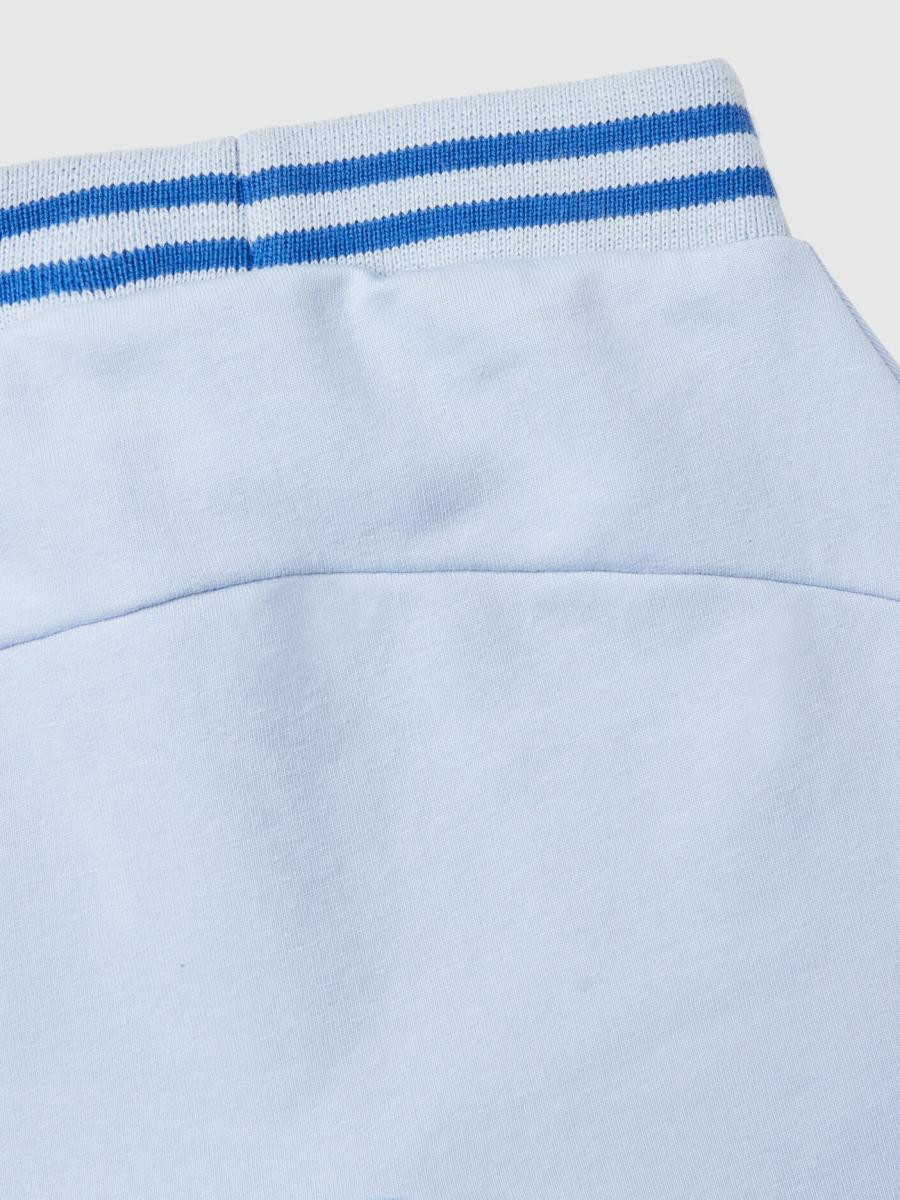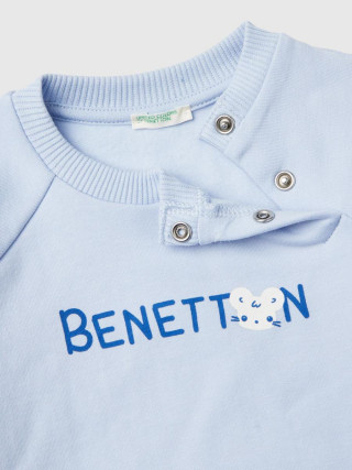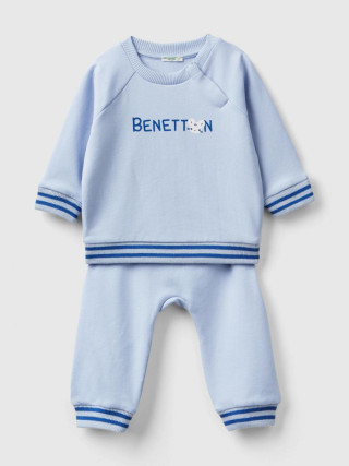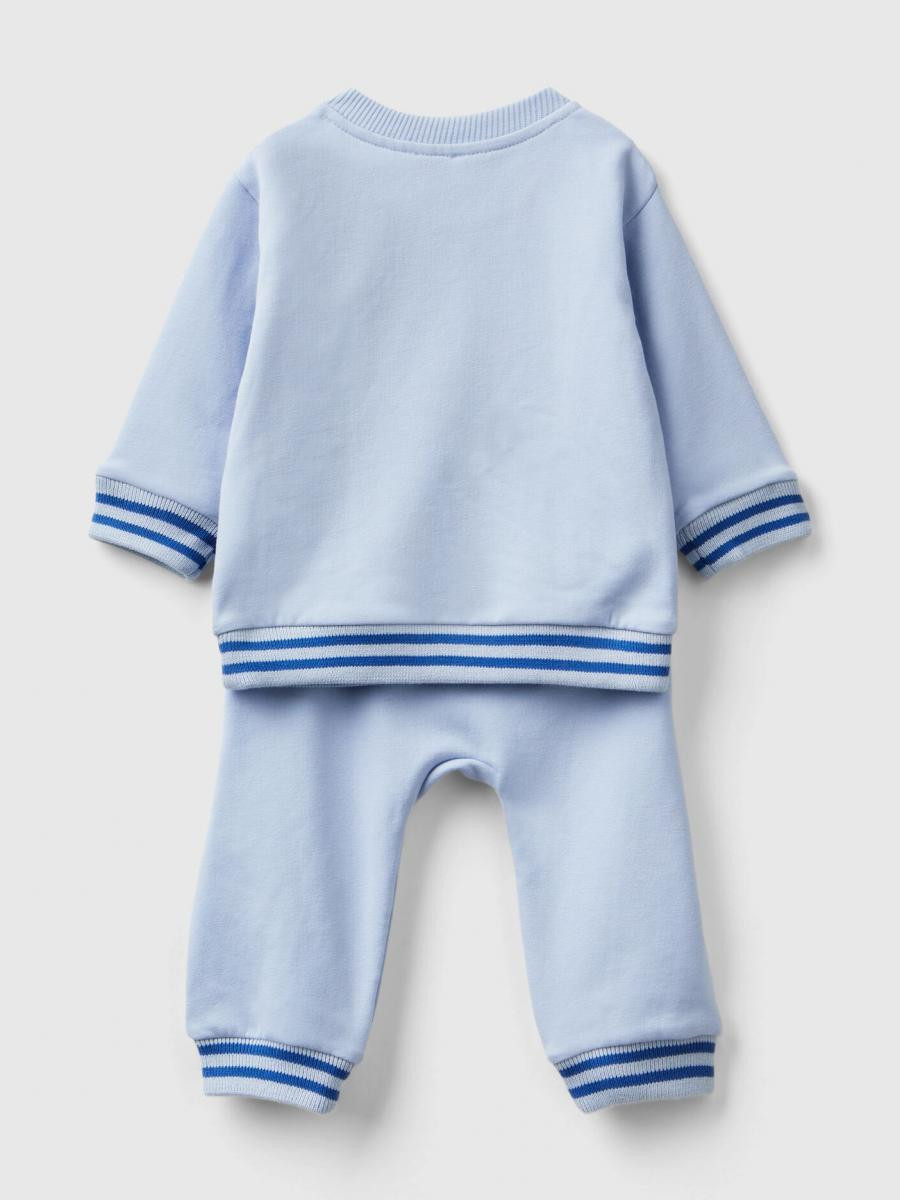 Benetton komplet za bebe od laganog rastegljivog materijala od mešavine pamuka sa prugastim ivicama. Dukserica dugih raglan rukava sa okruglim izrezom sa logom i životinjskim printom na prednjoj strani. Otvaranje sa dugmićima na levom rukavu. Duge pantalone sa unutrašnjom elastičnom trakom u struku.