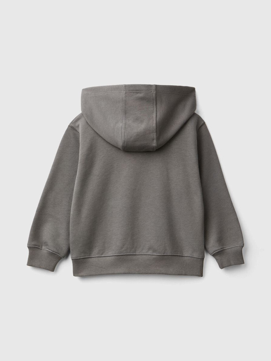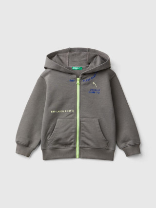 Benetton dukserica za dečaka od mekog čistog pamuka. Praktično kopčanje sa kontrastnim patent zatvaračem, prednjim našivenim džepovima i štampom slogana.