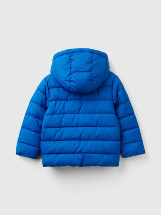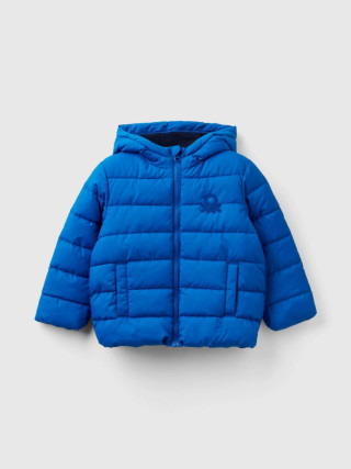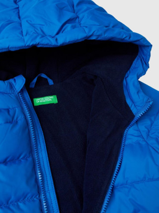 Benetton puf jakna za dečaka od tehničke Rain Defender tkanine. Topla, ali ultra lagana, sa podstavom Duck Free. Opremljena praktičnom kapuljačom, kragnom i prednjim džepovima. Otvaranje patentnim zatvaračem do brade i zaštitni patentni zatvarač. Stiker sa logom Benetton na levoj prednjoj strani.