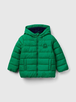 Benetton puf jakna za dečaka od tehničke Rain Defender tkanine. Topla, ali ultra lagana, sa podstavom Duck Free. Opremljena praktičnom kapuljačom, kragnom i prednjim džepovima. Otvaranje patentnim zatvaračem do brade i zaštitni patentni zatvarač. Stiker sa logom Benetton na levoj prednjoj strani.