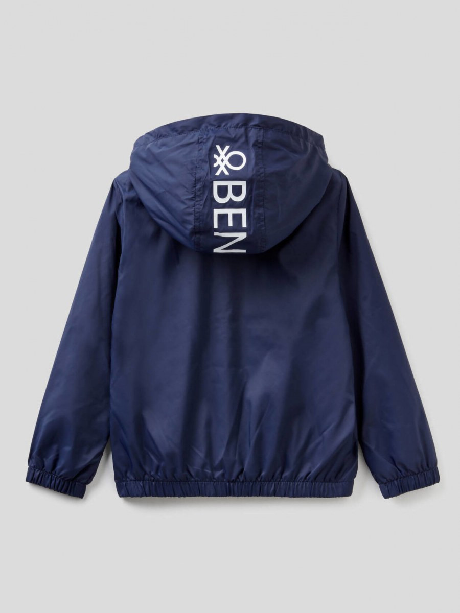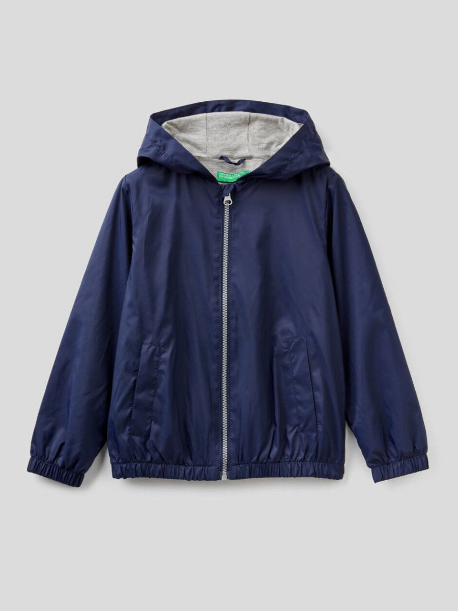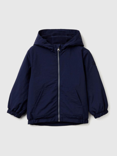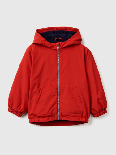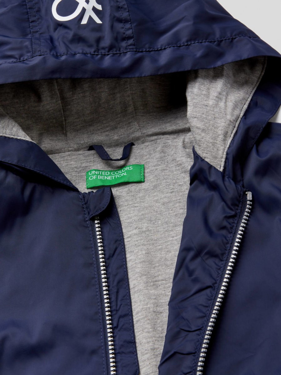 Benetton jakna dugih rukava sa kapuljačom za dečaka, postavljena sa patentnim kopčanjem i dva džepa na prednjem delu. Logo Benetton na kapuljači. Ova jakna štiti od lagane kiše.