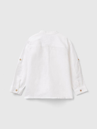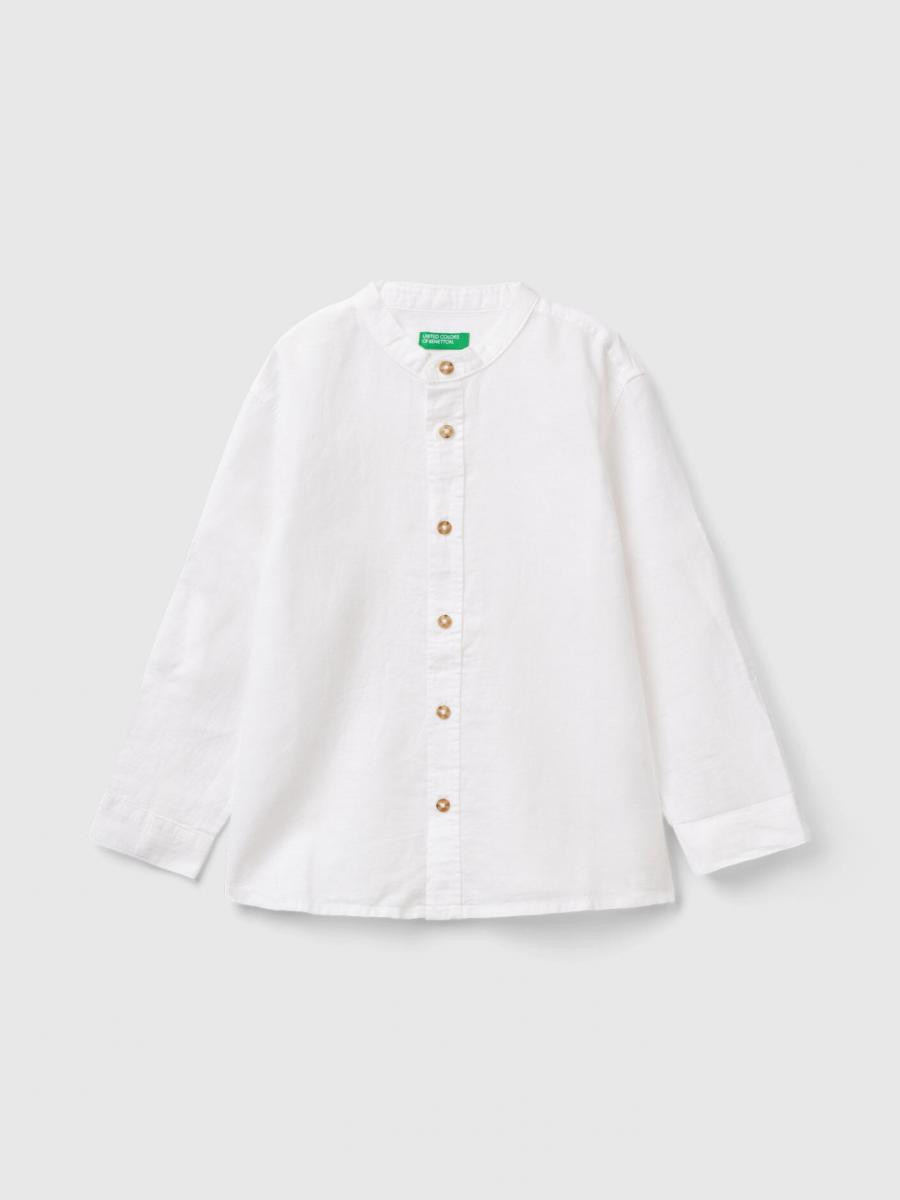 Benetton košulja za dečaka od mešavine pamuka i lana sa mandarinskom kragnom i prednjim kopčanjem sa dugmićima. Kaiš i dugme za fiksiranje zavrnutih rukava. Svež i moderan stil, u gradu ili na odmoru.