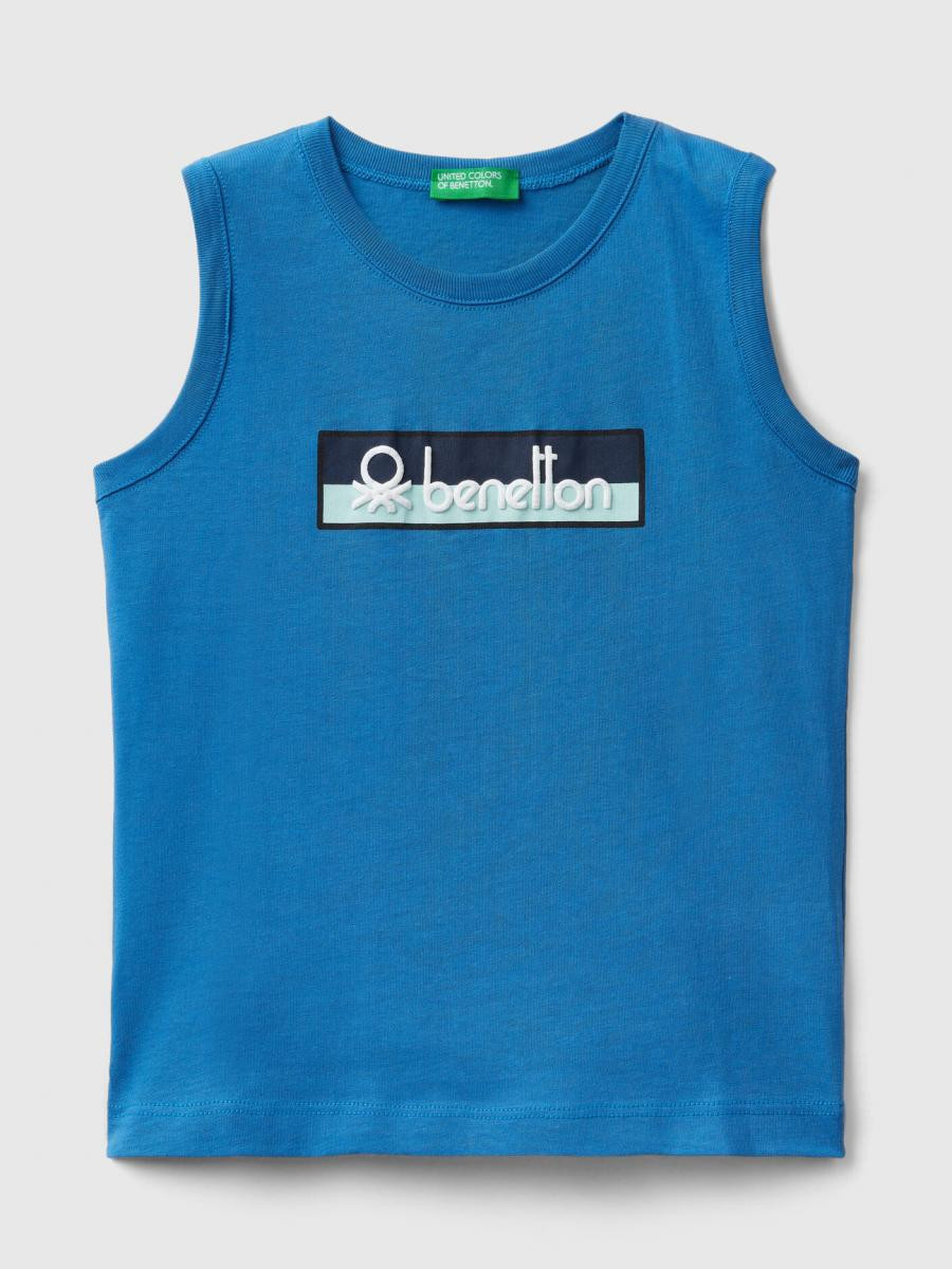Benetton majica za dečaka sa okruglim izrezom bez rukava od čistog organskog pamuka. Štampa sa prednje strane sa logom Benetton i reljefastim detaljima. Lagana i udobna, savršena za toplije dane.