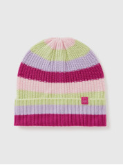 Benetton dečija višebojna kapa na pruge sa visokom manžetnom i etiketom sa logotipom. Specijalno pletivo sa karakteristikama šavova. Ovaj proizvod je napravljen na održiv način zahvaljujući projektu VASATEKS, koji omogućava da se voda iz proizvodnog ciklusa povrati i ponovo koristi u narednim procesima.
