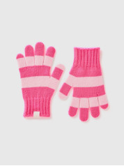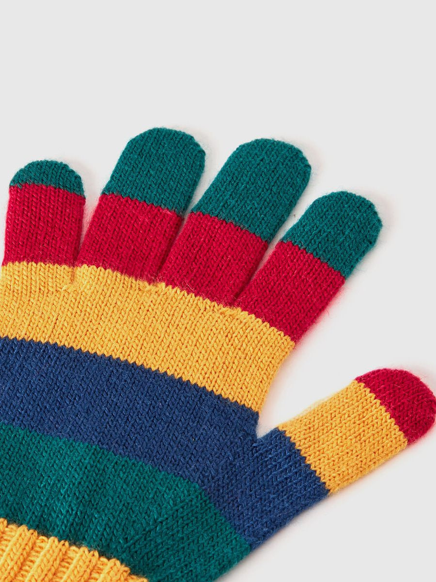 Benetton dečije višebojne prugaste rukavice sa manžetnom i etiketom sa logotipom. Specijalno pletivo sa karakteristikama šavova. Ovaj proizvod je napravljen na održiv način zahvaljujući projektu VASATEKS, koji omogućava da se voda iz proizvodnog ciklusa povrati i ponovo koristi u narednim procesima.
