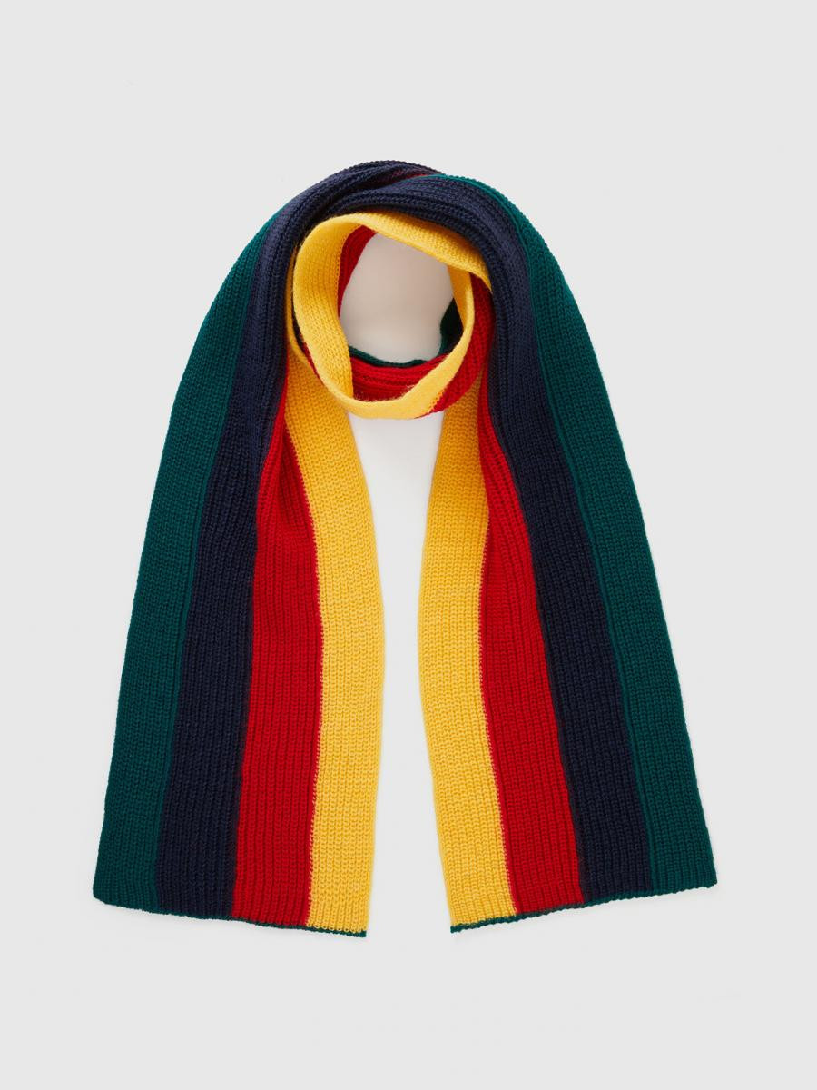 Benetton dečiji vuneni šal sa višebojnim vertikalnim prugastim umetkom. Ovaj proizvod je napravljen na održiv način zahvaljujuc´i projektu VASATEKS, koji omoguc´ava da se voda iz proizvodnog ciklusa povrati i ponovo koristi u narednim procesima.