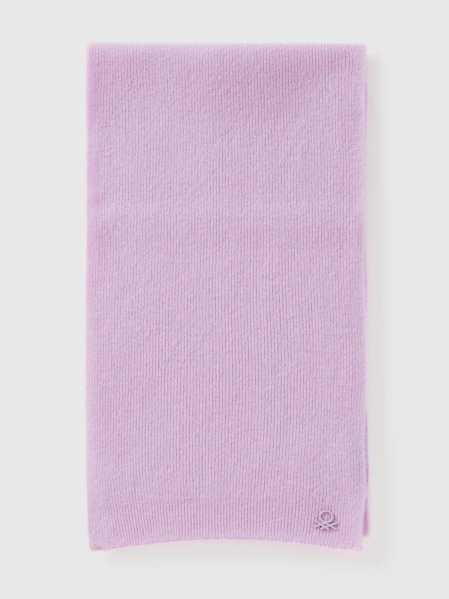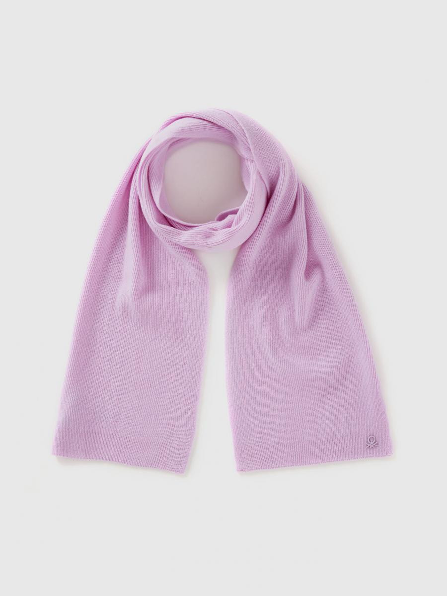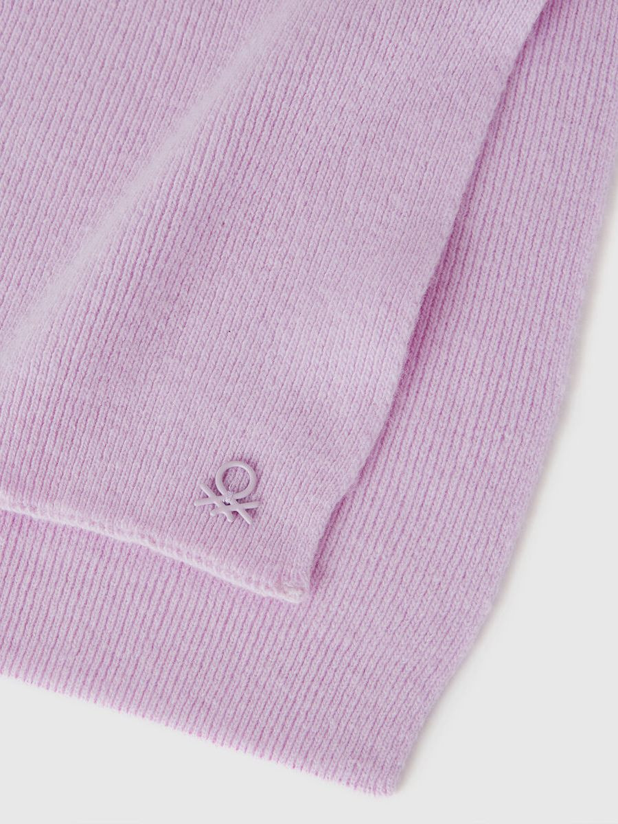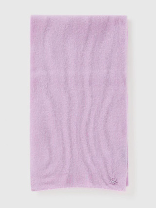 Benetton dečiji šal od meke vune sa logotipom na jednom kraju. Ovaj proizvod je napravljen na održiv način zahvaljujući projektu VASATEKS, koji omogućava da se voda iz proizvodnog ciklusa povrati i ponovo koristi u narednim procesima.